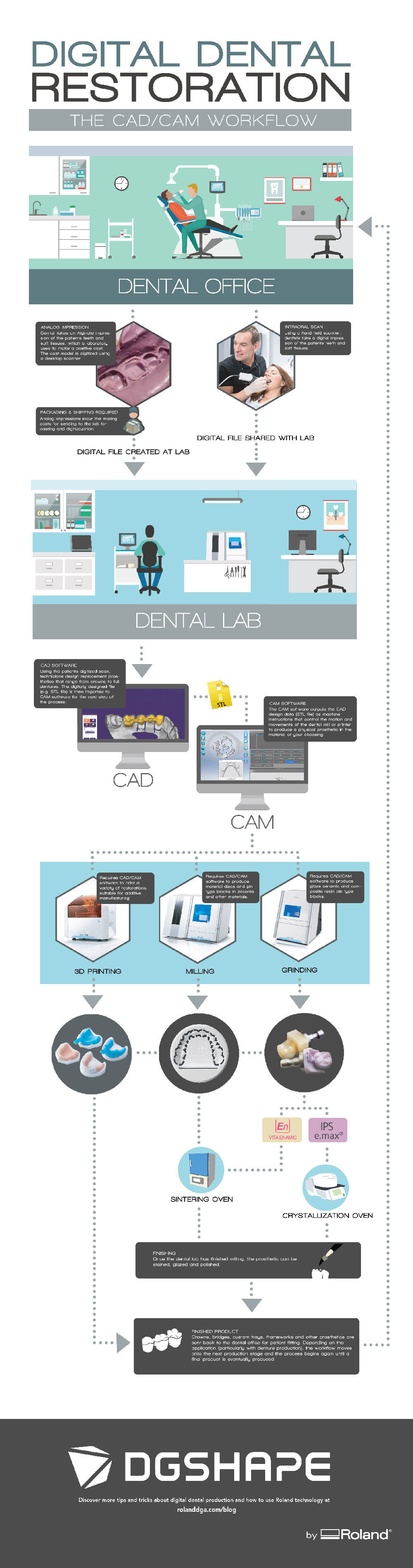 DGSHAPE by Roland DG presents a graphical look at the dental CAD/CAM workflow for producing patient prosthetics. A great reference for dental offices, lab technicians, patients and those interested in getting into dental lab production, it shows the digital process of producing crowns, inlays, onlays, bridges and other restorations -- from office visit to finished prosthetic.