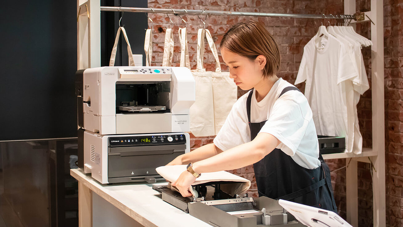 A workshop planned with the same theme was set up in the last room of the exhibition where visitors could make their very own items featuring the work of Tatsuno Kingo. The membership-based, shared-factory Makers' Base that runs popular workshops in Tokyo organised the event, and Roland DG provided the BT-12 direct-to-garment printers that are capable of printing on cotton-based fabrics.