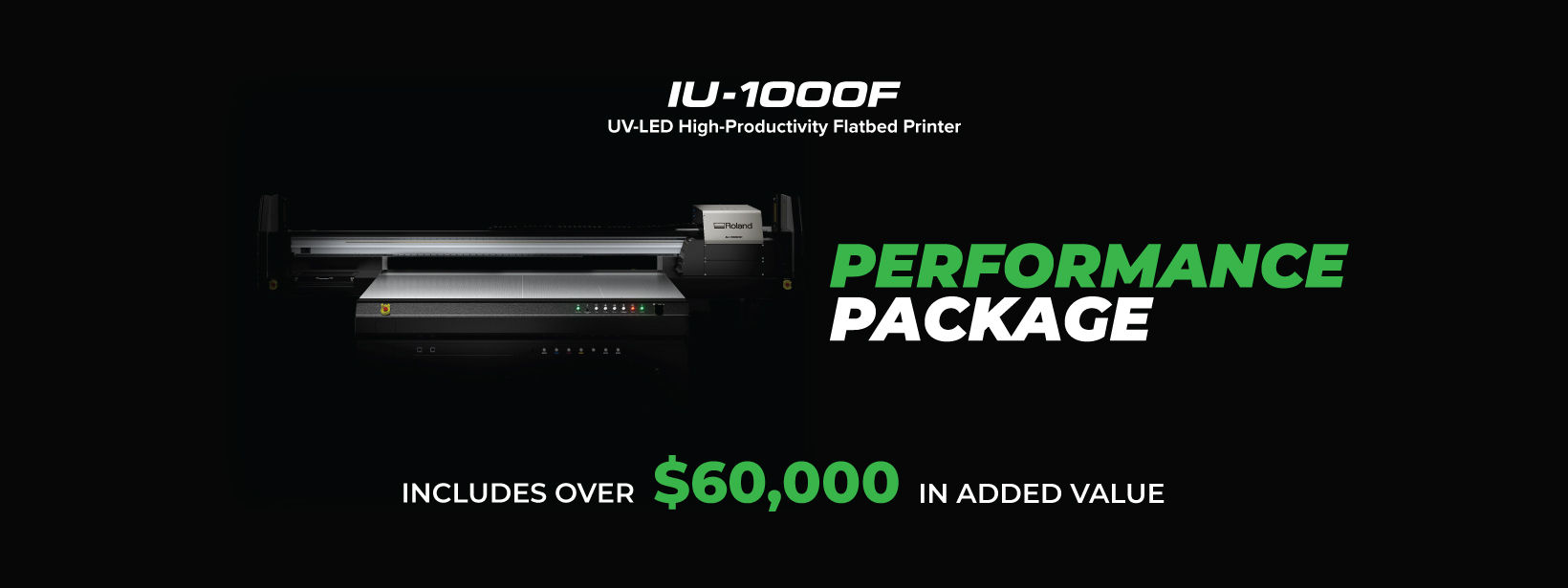Until the end of September, customers can take advantage of Roland DG’s Performance Package deal on the IU-1000F. Now just $225,000*, the package includes ink, delivery, installation and a 4-year Gold level warranty, representing over $60,000 in added value.